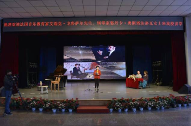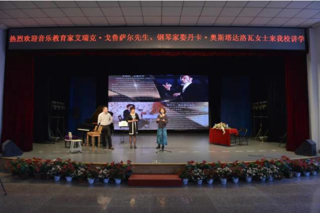 我校演播厅举办了“高雅艺术进校园,大师就在我身边”活动。这次活动有幸请到了法国著名音乐教育家艾瑞克.戈鲁萨尔先生、钢琴家姿丹卡.奥斯塔达洛瓦女士来我校开展音乐教学交流。